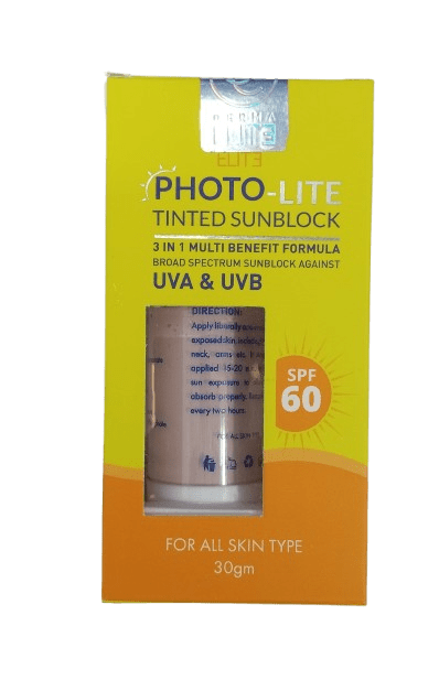 Derma Elite Photo-Lite Tinted Sunblock SPF60 is a premium broad-spectrum sun protection cream with a natural tint that shields your skin from harmful UVA & UVB rays while giving a smooth, flawless look — perfect for daily use in Pakistan’s strong sun.